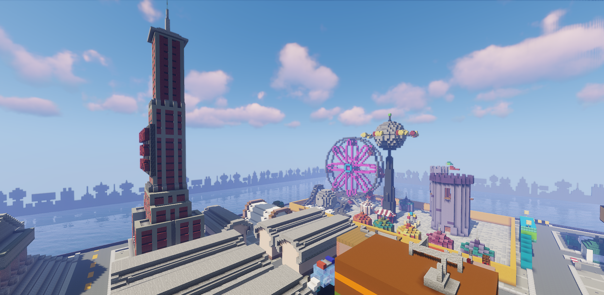 The best hide-and-seek maps are not the ones that simply have a lot of corners, but the ones where the space itself encourages creativity. Futurama Hide and Seek handles this very well. In front of the players is a dense futuristic city with dozens of recognizable buildings, tall towers, packed development, and many hidden spots that work perfectly for the hide-and-seek format.
