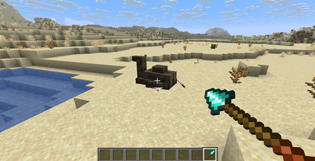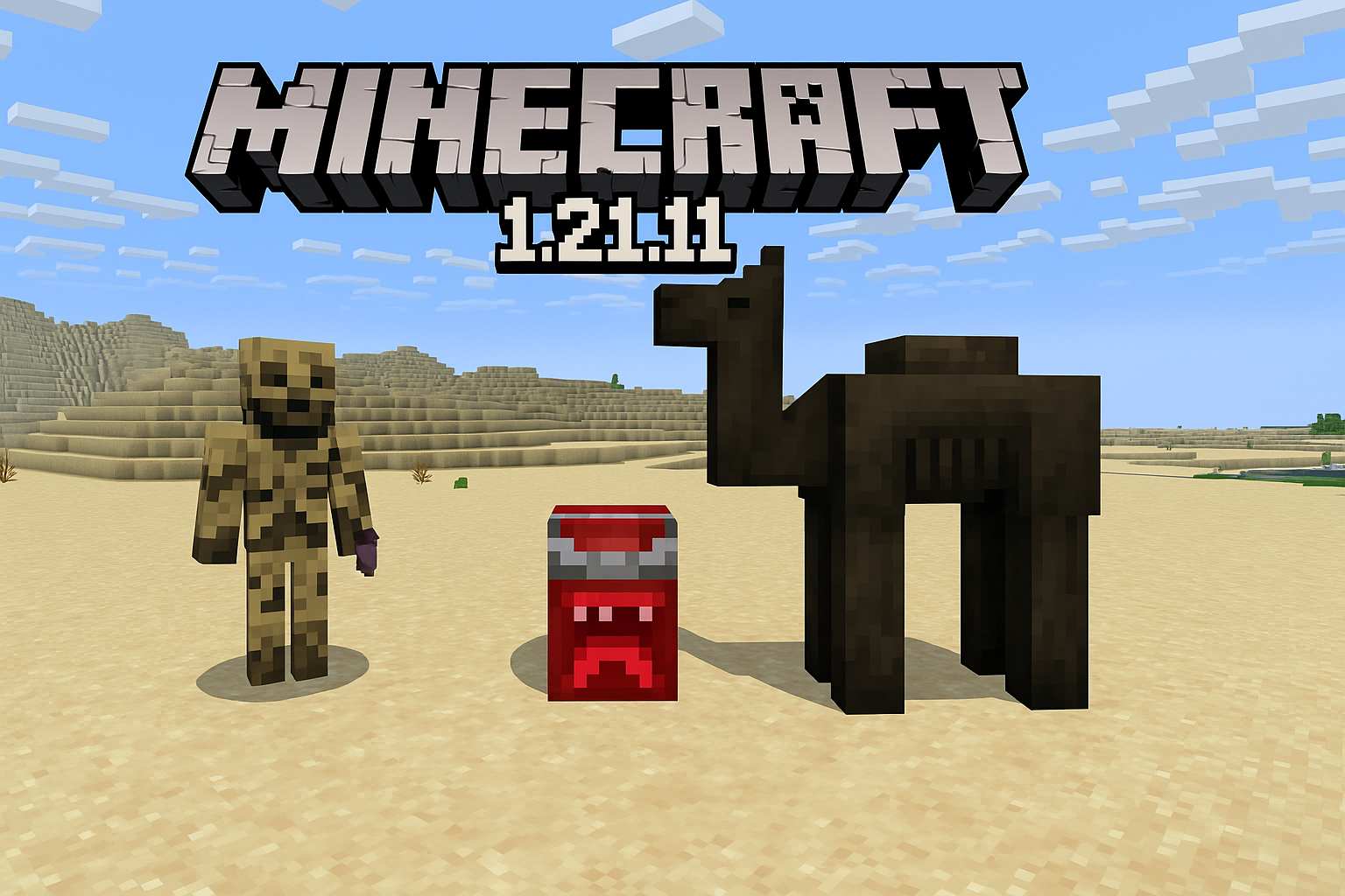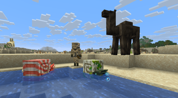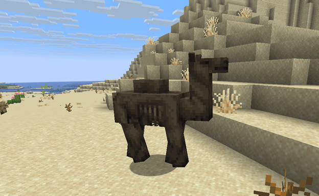 Cadaver Camel — a camel variant in undead form from the update that appears on the surface of deserts. Most often it spawns immediately with two riders — a spear-wielding cadaver and a dune dweller, which turns it into a full-fledged combat unit. It has an impressive health pool of 32 points and, if a hostile mob is riding it, fully obeys it, purposefully moving toward the player, whereas without a rider it remains friendly and can despawn like a regular hostile mob (which can be prevented if you mount it). It feeds on rabbit feet, cannot be bred, and upon death drops 2–3 units of rotten flesh.