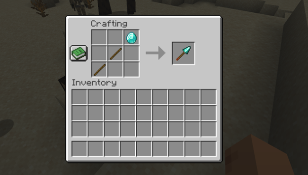 Spear — a universal weapon presented in seven variants at once — wooden, stone, copper, iron, gold, diamond, and netherite, with the chosen material directly affecting speed and combat characteristics. The key feature is the presence of a minimum attack distance, because of which a target standing too close takes no damage, but the spear has an increased maximum attack range compared to other weapon types. In addition, zombies, cadavers, as well as regular and zombified piglins can now spawn with a spear in hand, and in combat it supports two attack modes — a thrust and a running strike. The spear is crafted from 2 sticks and the corresponding material; for example, a wooden one requires a plank.