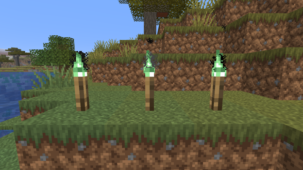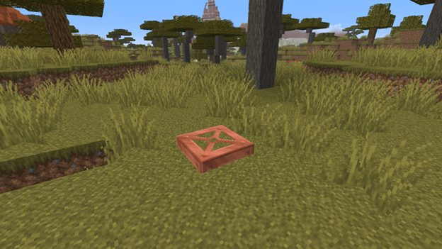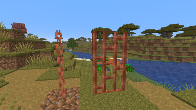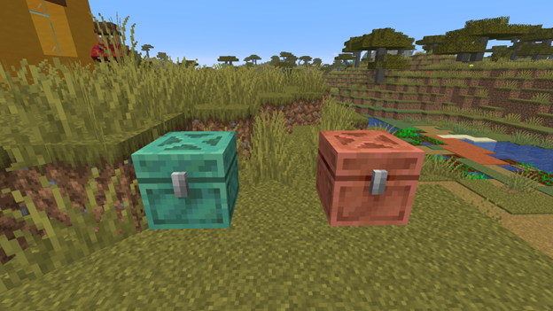 Blocks and items. This section introduces copper grates, chains (crafted similar to iron ones), a chest (requires covering it with copper ingots), a lantern, and improved torches with distinctive glowing. The lightning rod now also has oxidized variations. Decorative shelves can be crafted in any type of wood.