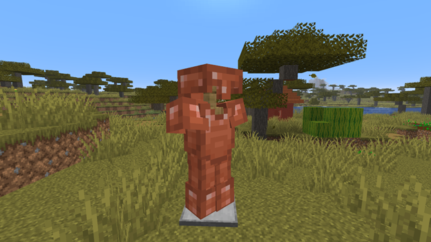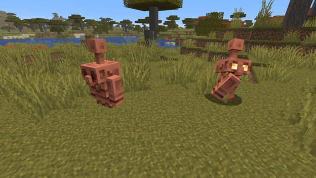 · Mobs. The main star of the update is the new Copper Golem, which can move and has oxidation stages. It is smaller than the familiar Iron Golem and can interact with the environment. Has 6 hearts of health. Drops several ingots upon death. Takes no damage from falling or drowning. It can also carry items in its hands, seeking nearby chests. Iron Golems can place a decorative flower on its head, which unfortunately falls off when the Copper Golem turns into a statue.