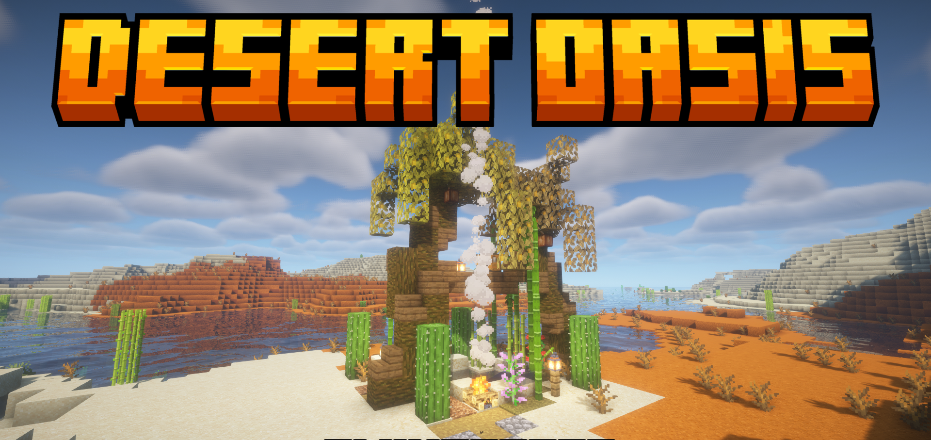 The desert in Minecraft looks too monotonous, and that is exactly why Desert Oasis is perceived as a pleasant revitalization of a familiar biome. The mod adds naturally generated oases — rare corners of life among the sands, where you can find water, palm trees, and dense vegetation.
