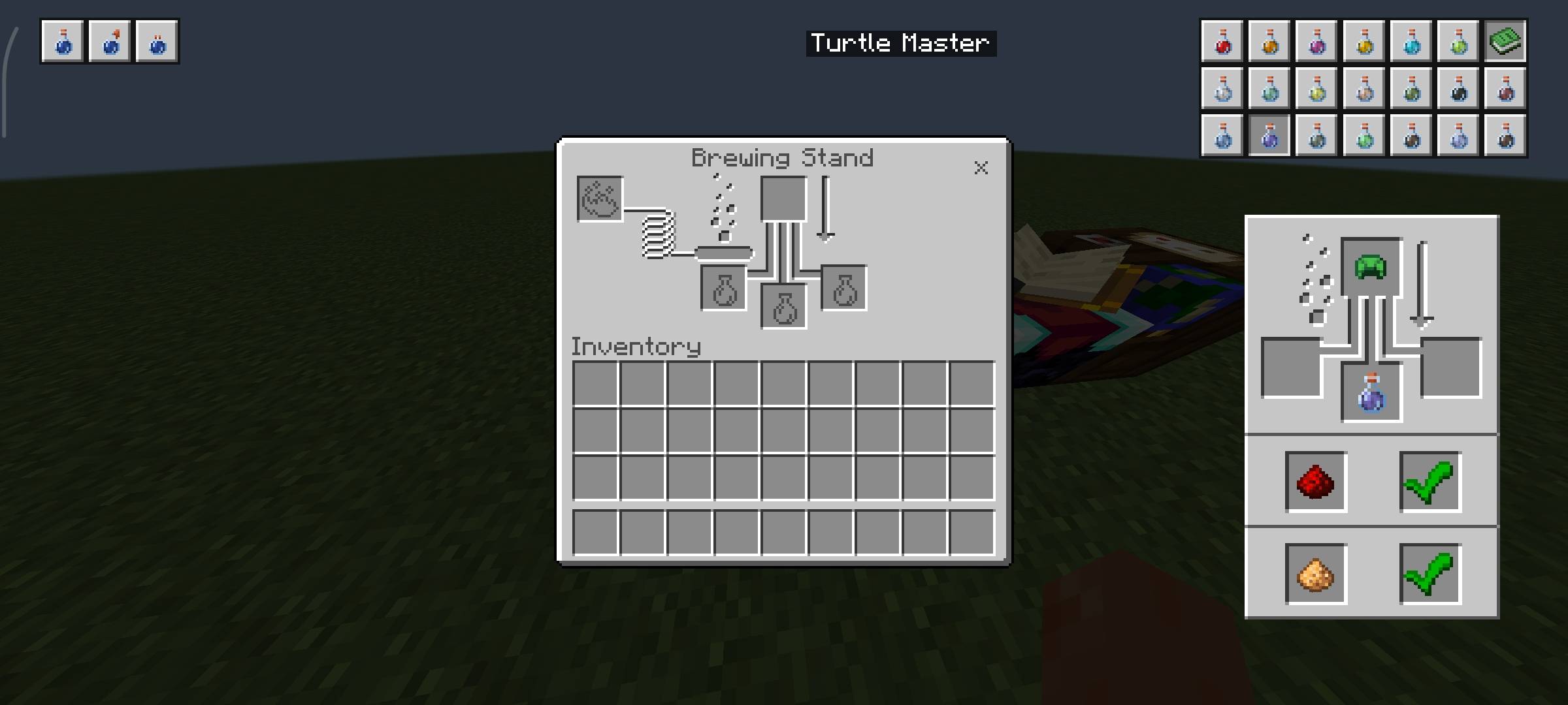 The placement of base potions is also implemented conveniently: options for awkward, splash, and long-lasting potions are gathered in a clear area of the interface. Because of this, the process becomes noticeably more comfortable, especially for beginners and those who rarely work with alchemy.